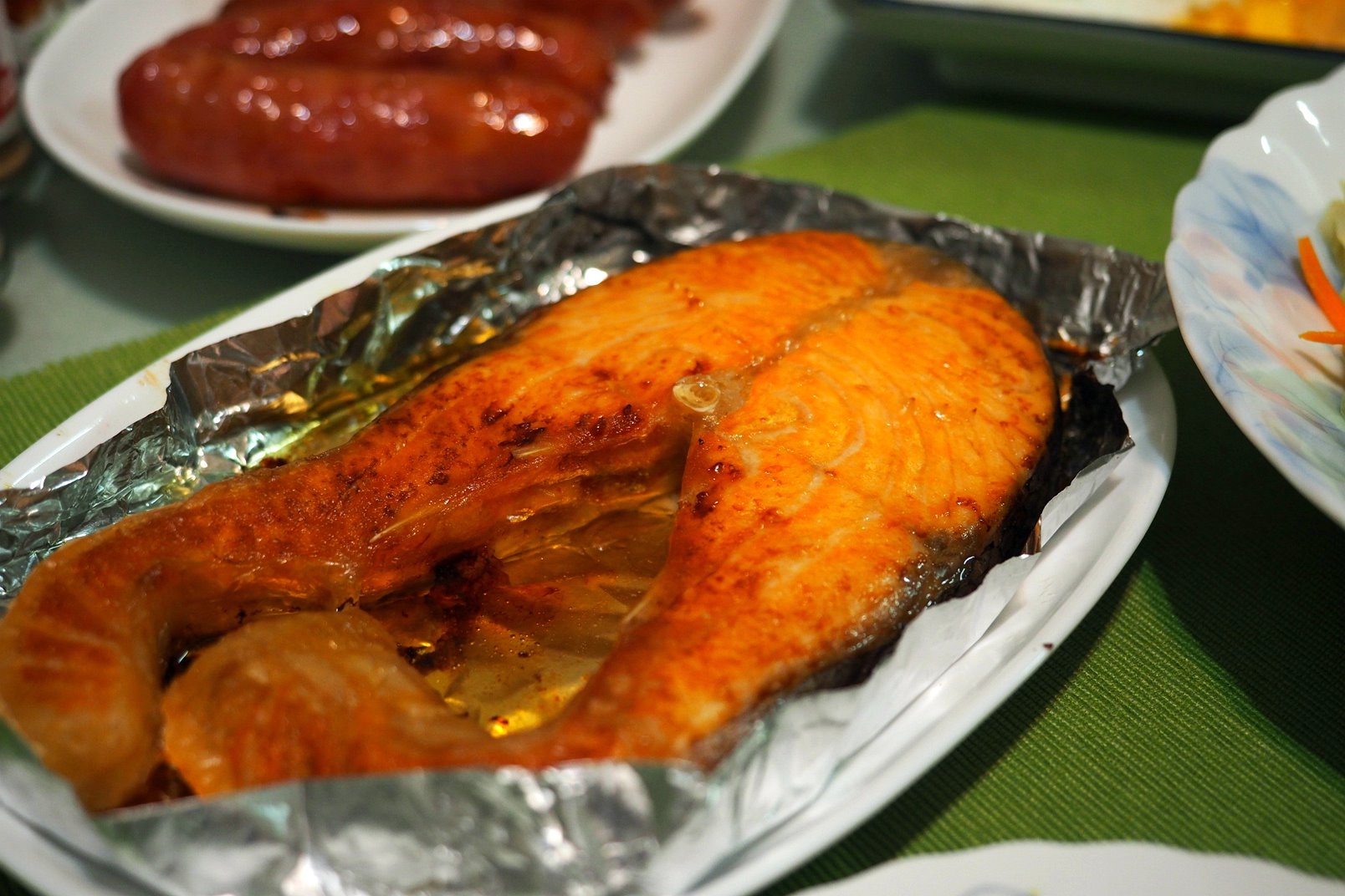 中途喵一下~ 其實我很想幫鮭魚翻面~ 但是鋁箔忘了上油~ 黏住了XD