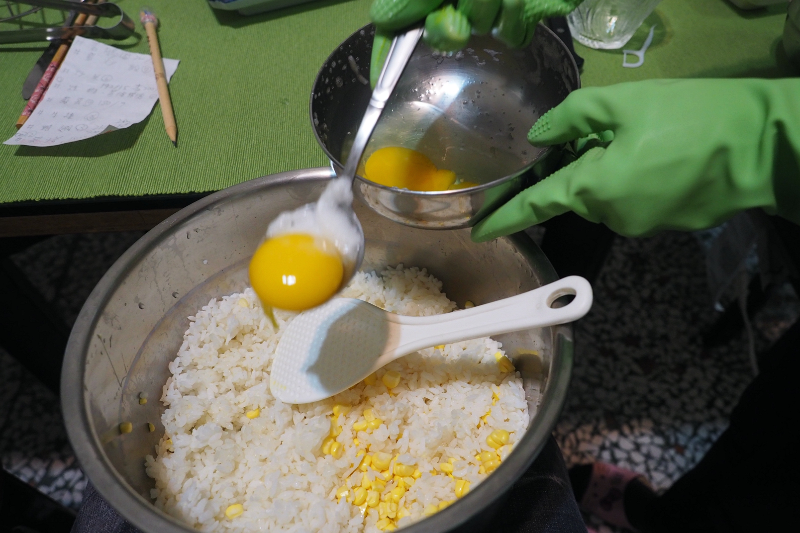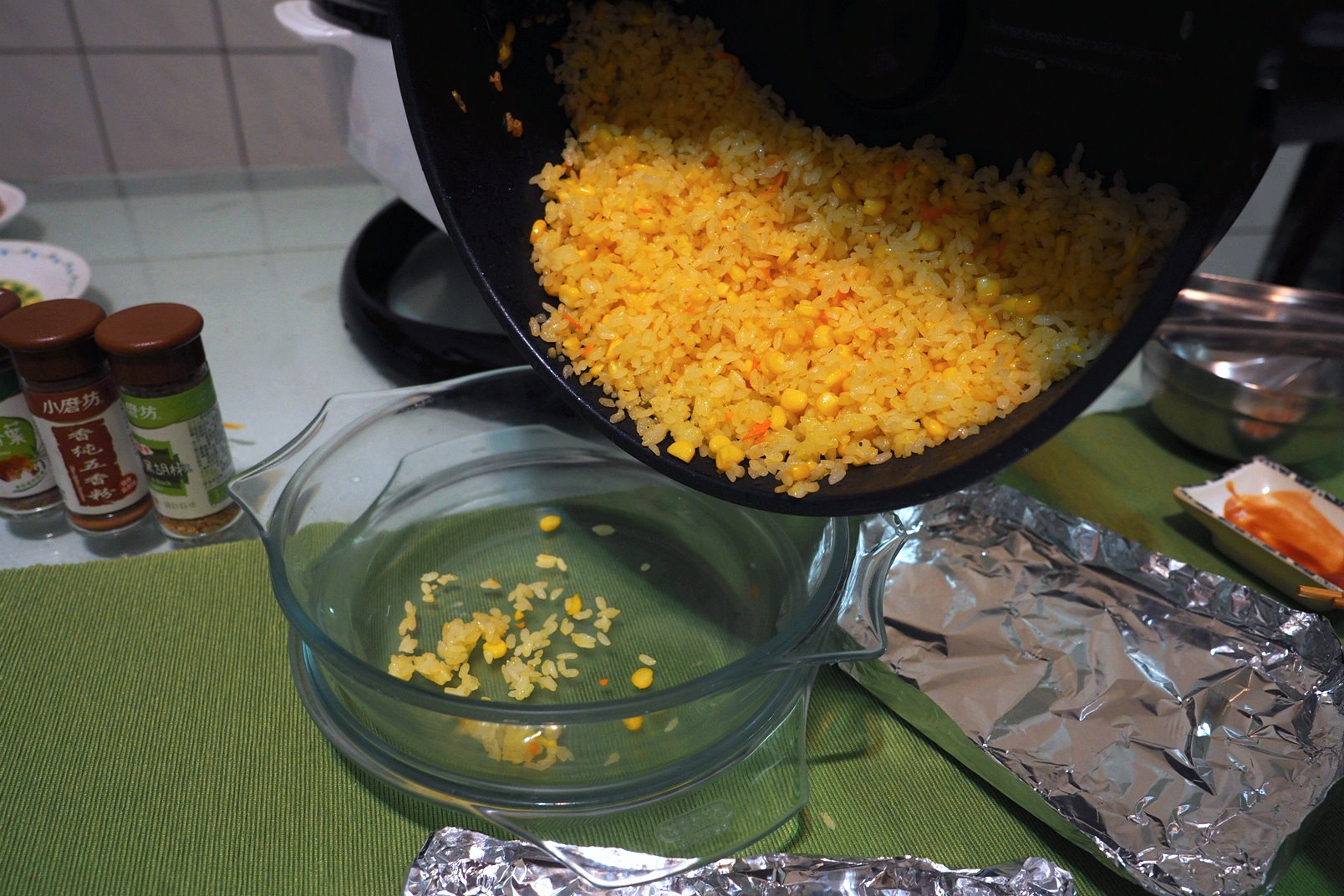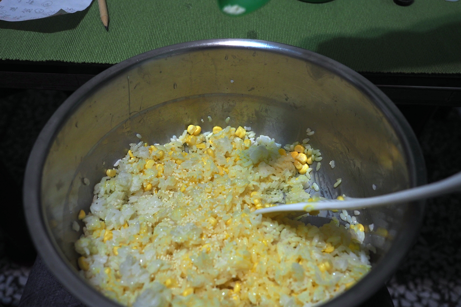 不過這道也是有些前置作業的~ 首先準備好隔夜飯~ 為了豐富配料! 裡頭加入了玉米粒!