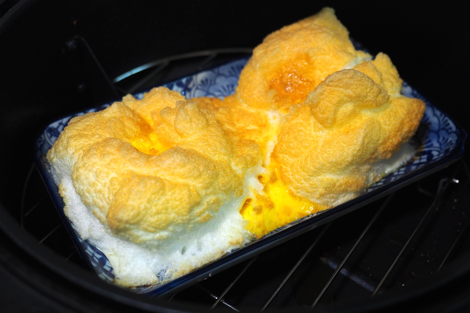 擔心煎蛋會不好清潔內鍋~ 所以我乾脆放上盤子! 將發泡的蛋白鋪上後~